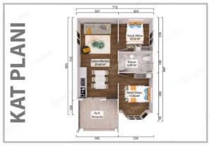 Our 59 m2 2+1 bedroom Medium model can be built quickly thanks to the prefabricated construction technology. It is the most efficient in terms of space utilisation compared to other buildings in the same category. The building has a 12 m2 and a 13.5 m2 bedroom and a 29 m2 living room with American style kitchen and bathroom. It is ideal for people starting out in life, but also for single people. It can be built with accessibility system if required.